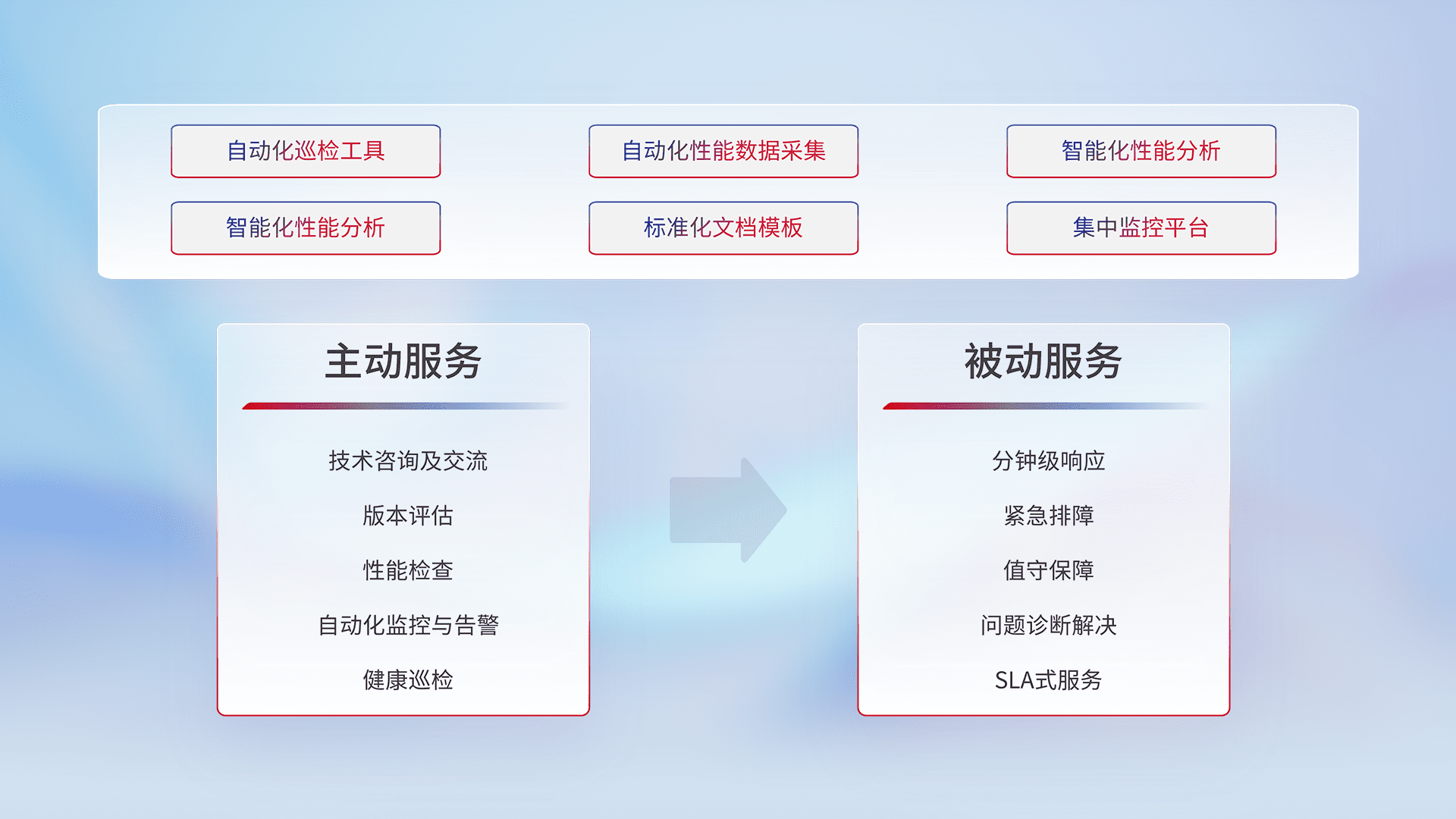 智能化工具和标准化文档,,保障服务质量,,提供主动服务(包含技术咨询、、、、版本评估、、性能检查、、自动化监控与告警、、健康巡检)和被动服务包含(分钟级响应、、紧急排障、、值守保障、、、问题诊断解决、、、SLA服务)。。。。